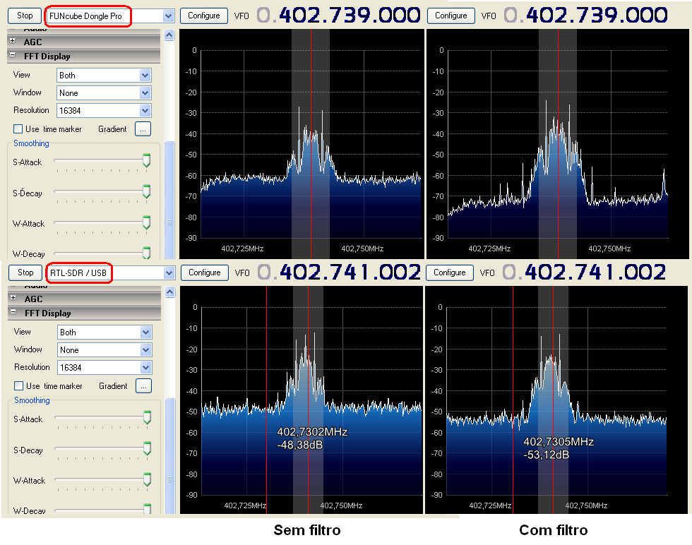Os dois dongles foram ajustados no ponto de melhor sensibilidade da cada um, que pode ser visto na tela de ajustes de cada um, com os AGC desligados, e os softwares com resoluções equivalentes (taxa de amostragem/FFT resolution: 96k/4k=24 Hz para o FCD e 1024k/32k=32 Hz para o RTL).