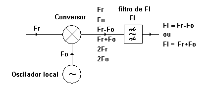 Uma forma muito usada para converter uma freqüência alta Fr em outra mais baixa (ou mais alta) FI, mantendo todas as suas características espectrais, é o conversor heterodino ou misturador ou modulador de produto. Ele é baseado num circuito que tem função de transferência não linear, mais precisamente que contenha um termo do tipo quadrático (por exemplo: um diodo ou um transistor). Nele são injetados o sinal na freqüência recebida Fr a ser convertida, e o sinal de um oscilador local Fo. Pela sua não linearidade, o misturador eleva ao quadrado a soma dos dois sinais, o que resulta na sua saída em uma série de novos sinais, além dos originais, como mostra a figura seguinte: