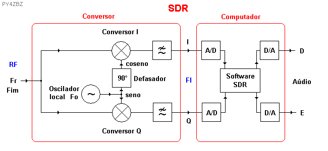 - um circuito conversor de freqüência em quadratura (hardware), que converte a freqüência do sinal RF a ser recebido, para uma freqüência intermediária FI suficientemente baixa para poder ser processada por uma placa de som de computador ou outro conversor A/D (analógico para digital) adequado, em dois canais, chamados I e Q,