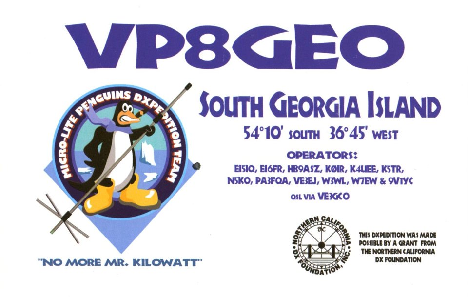 3 VP8GEO - CW Year: 2002 Band: 10, 12, 30m Specifics: IOTA AN-007 South Georgia island |
