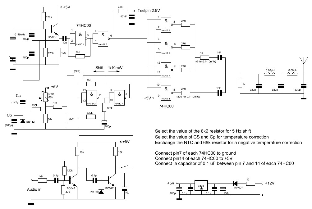 The frequency has to be very stable. It is quite difficult to adjust the beacon transmitter on a frequency of 10140.0 tot 10140.1 kHz and to avoid drift due to temperature changes. A temperature correction circuit was made with a NTC resistor and a varicap. The drift could be reduced considerably. For a positive frequency drift correction, you have to connect the NTC in accordance with the diagram. For a negative correction, the NTC resistor and 68k resistor have to be exchanged. Of course you can also take a NTC resistor with a different value. Exchange the 68k resistor then for one with the same value as the NTC. Increasing of Cs and reducing Cp increases the correction, reduction of Cs and and increasing of Cp does reduce the correction. Finding the correct value is a question of trying out while cooling down and warming up the transmitter with various values of Cs and Cp. Between 5 and 35 �C, the temperature drift is only 4 Hz.