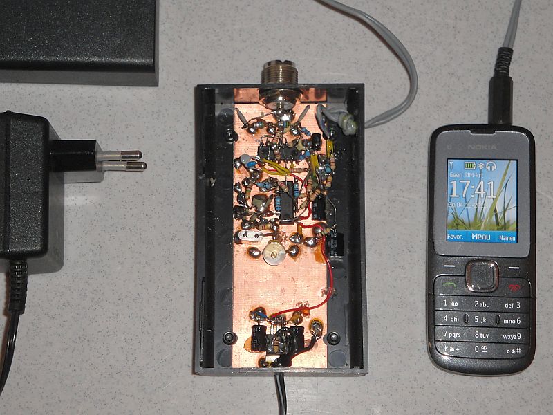 For keyng the beacon transmitter with morse code, I had already a solution with a light dependend resistor (LDR) in front of a PC monitor. On the screen was a black and white flashing square in the rythm of the morse code. But then, the PC had to be switched on all the time, 100 watt power to key a 10 milliwatt transmitter, what a waiste of energy! There had to be a better solution. For example an audio player! You can set the audio player so that it repeats an audio file all the time. For making the audio WAV file, a computer program in Python was written. My call in morse code with a dot length of 3 seconds and also an audio file with a dot length of 6 seconds. When you want to change the dot length, you do not have to re-program a micro controller, but you simply select another audio file on the audio player! And the beacon transmitter was modified so that it could be keyed by the incoming audio signal. A detector makes zeroes and ones of the morse code tones. And... my mobile phone can also pay WAV files! I do not use that telephone to make telephone calls, I do not have friends. When you do use a telephone as audio player, take out the SIM card, otherwise incoming telephone calls can disturb the modulation. But you can also use all kinds of other WAV/MP3 players of course.