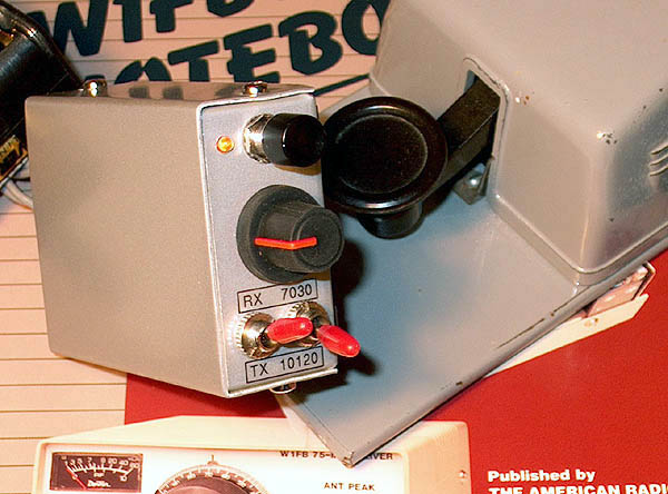 Eenvoudige Morse code transceiver met een seinsleutel die je op je been kunt klemmen.