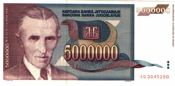A Yugoslav banknote of 5 million dinar also shows Mr. Tesla and his famous coil,
