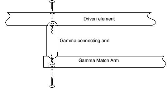 Using a sheet-metal screw, screw the Gamma connecting arm to the Gamma arm forming an 'L' shaped gamma assembly. Place a screw through the 8mm hole in the Driven element and screw the Gamma assembly to the element using a sheet-metal screw (see fig 7).