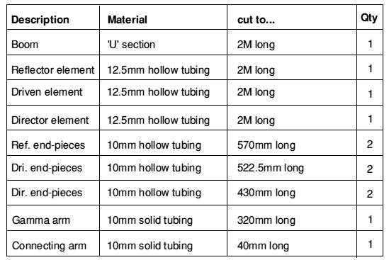 It is almost unbelievable, but the 'standard' sizes of tubing available are perfect for a 6M beam. I bought two 2M length of 10mm hollow tubing and carefully cut them to the dimensions shown in Table 1. So, one length gave me the correct lengths for four end-pieces! (reflector and director).