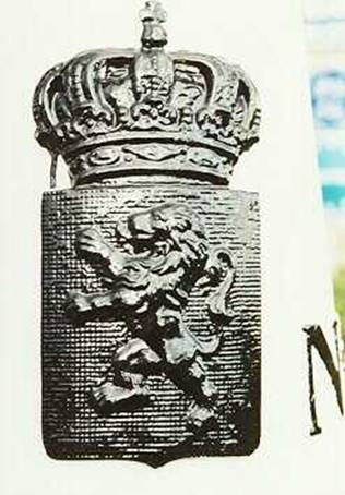 Dit is het wapen van Nederland. Opvallend: de leeuw draagt nu een kroon en is bewapend met zwaard en pijlen. |