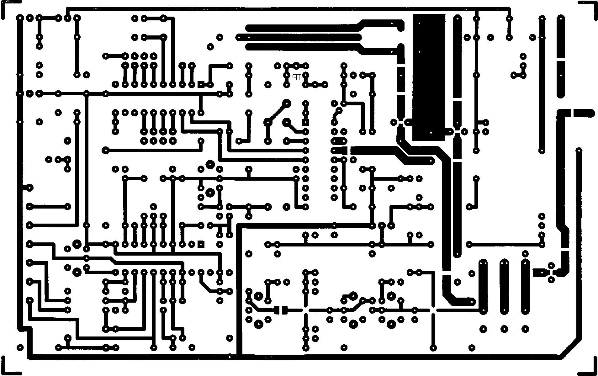 In de figuren 23top.gif en 23bot.gif zijn de print layouts van de sporen- resp. de koperzijde van de print weergegeven, in 23parts.gif de componentenlayout. Dit zijn gescande plaatjes omdat Protel geen uitvoer kan maken anders dan een papieren print of gerber-files....