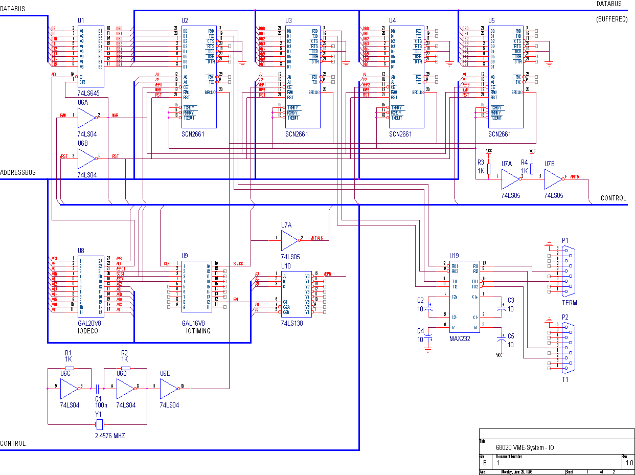 This board uses Mototrola 68020 processor running at 33 MHz. A VME-bus backplane holds all boards. The CPU-board has 1 MB static RAM on board, and 32 kB EEPROM containing the bootloader. Two GAL's are used, source-code is included on this page.