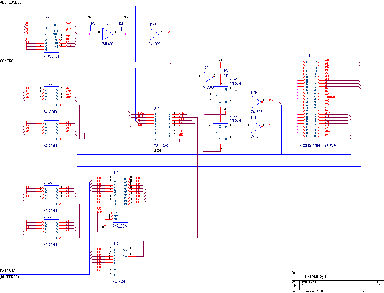 On the IO-board there is room for 4 EPCI's. In my system only two are placed on the board (named /term and /t1) Further a real time clock type RTC72421 and a simple SCSI-interface is available. This SCSI-interface interfaces directly to the device, without any interrupts. Therefore it is not very fast but reliable. There is logic in 3 GAL's, of which the sources are included.
