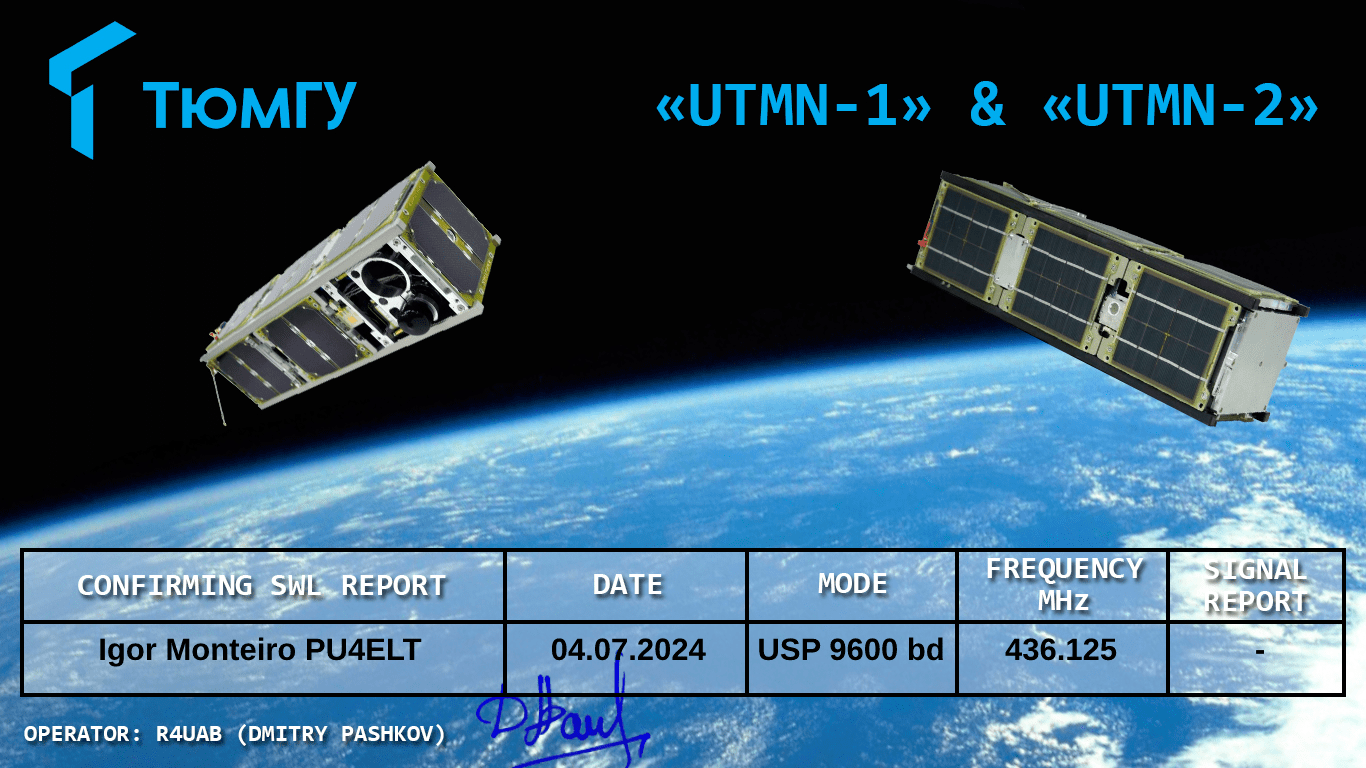 No dia 04/07/2024 as 00:27 UTC eu recebi 4 pacotes do UTMN-2 (RS27S) quando ele passava sobre o Brasil. Eu usei uma antena Yagi de 7 elementos e um RTL-SDR V3 para receber os pacotes :