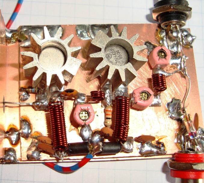 Esta foto mostra dois trimers mas o da esquerda foi retirado de operação. A bobina tem 4 voltas de fio 24AWG em forma de 3mm de diametro (broca). A saida deste modulo tem um divisor capacitivo para alem de sintonizar o coletor corrige a impedancia para o proximo circuito.