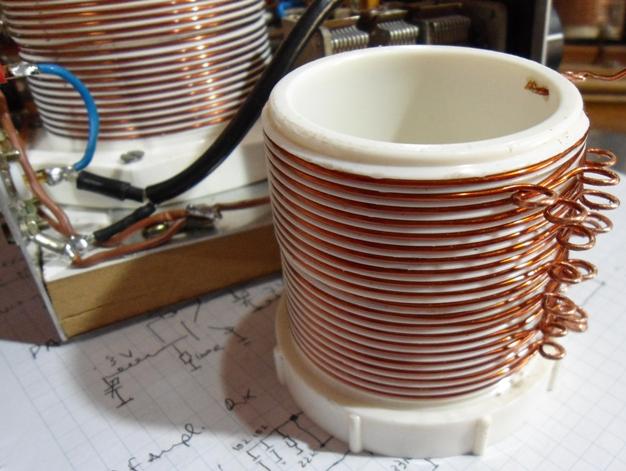 A bobina foi enrolada em um niple de PVC branco de 1 1/2 polegadas, este niple foi serrado onde retiramos uma das duas partes com rosca, esta parte foi lixada até que quando colocada sobre a outra rosca restante ficava alinhada e então colamos as duas roscas. Obtivemos uma forma ideal para bobinas com espaçamento.