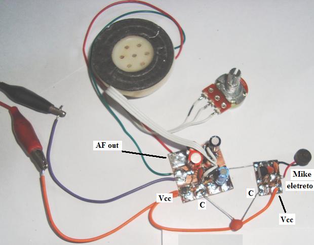 Ligar a saida do amplificador de mike (C - coletor do transistor) a ilha C (coletor do transistor 2N3904) da placa de audio, não ligar na entrada do amplificador pois fica com muito ganho e dá microfonia.