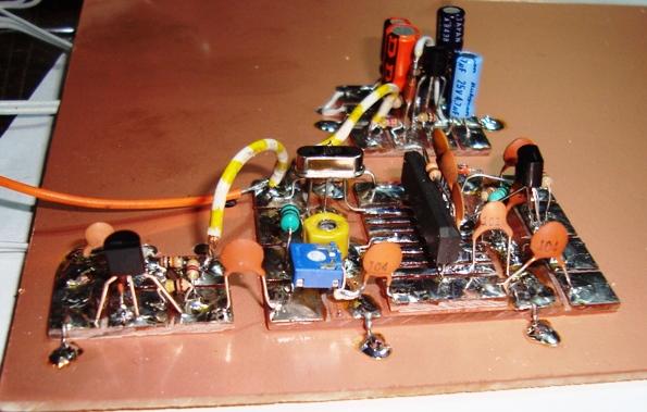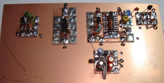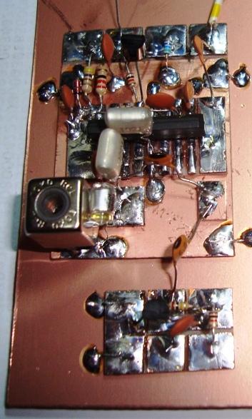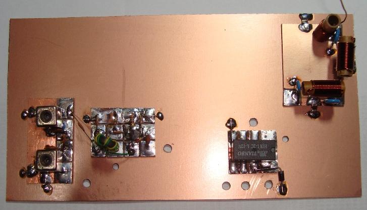 Fizemos uma placa com 3 ilhas, usamos duas, uma para a conexão varicap + r100k + Cap2nF, outra para r100+ cap104, a terceira foi soladao um zener que aparece nas fotos mas não utilizamos.