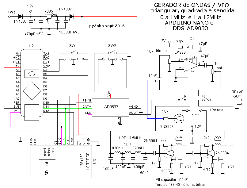 arduino nano, AD9833 dds e LM386, rele com o filtro LPF (capacitores