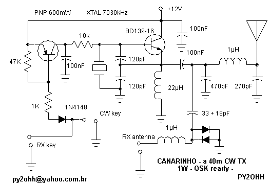 In the CANARINHO simple version we have only the TX, keyed directly by the CW key. Building it this way we have a current of about 180mA in the key, but it is no good because it burns the key contacts in little use time.