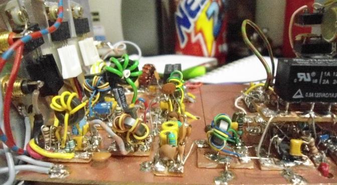 A saida do filtro passsa banda (BPF) é ligada a saida do amplificador de RF do RX, que em Tx não tem alimentação, e tambem ligado diretamente ao buffer do tx. O sinal vindo do transformador trifilar passa pelo filtro passa banda e vai para o buffer do TX. Dai segue para o driver e para o PA em push pull. O circuito fornece 18W com o dreno alimentado com 13.8V e cerca de 35W com 22V.