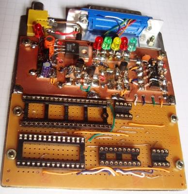 Como tinhamos disponiveis varios tamanhos de soquetes montamos em uma placa PCI padrão furada de trilhas paralelas (50x100mm), cortando as trilhas conforme necessidade e jumpeando as trilhas formando o circuito.