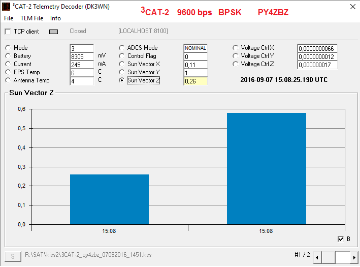 Em 07-09-2016 copiei o sinal dele em BPSK a 9600 bps em 145,970 MHz, com o FUNcube dongle e uma antena Yagi OWA de 6 el com boom de 2,1 metros, e o SoundModem de UZ7HO. O sinal foi sintonizado em USB com banda de 16 kHz de forma a ter o centro do sinal demodulado em 8 kHz: