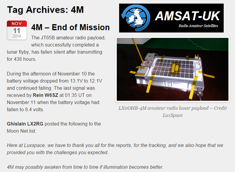 Em 23-10-2014, na hora exata prevista para ligar o TX do 4M (19:17 UTC), 78 minutos após o lançamento do foguete, fomos a primeira estação do mundo a copiar a primeira transmissão 4M !: