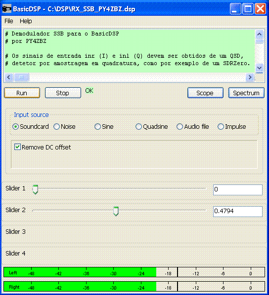 Meu primeiro software SDR é de um demodulador SSB (USB e LSB) com AGC, para ser usado em conjunto com um hardware SDR como por exemplo o SDRZero. Os sinais I e Q produzidos pelo SDRZero são aplicados na entrada estereo da placa de som, sendo I no canal direito e Q no esquerdo. Comentarei, com ilustrações feitas com o próprio BasicDSP, o programa exemplo.