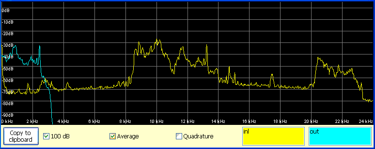 O BasicDSP contém um osciloscópio e um analisador de espectro, ambos de dois canais, com os quais podemos observar qualquer variável. Por exemplo, a figura seguinte é da tela do analisador de espectro, que mostra as variaveis inl = I , em amarelo, e out = áudio de saída, em azul, do meu programa. Podemos ver que no sinal I fornecido pelo SDRZero temos três sinais de SSB (um entre 9 e 11, outro entre 11 e 13 e outro entre 20 e 23 kHz, aproximadamente). Podemos ver também que o sinal de áudio demodulado tem espectro igual ao do sinal entre 11 e 13 kHz. Para ver qualquer variável basta entrar o seu nome nos retângulos amarelo e azul.