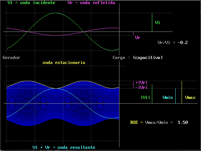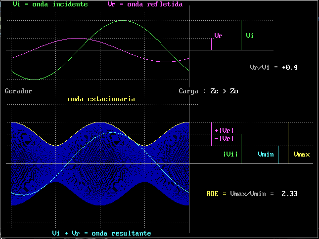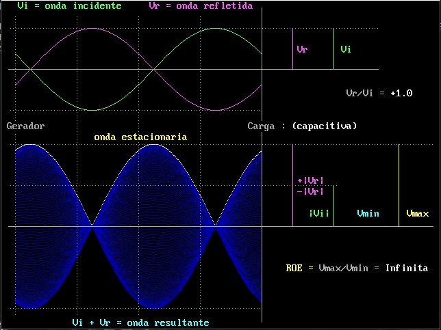 - a onda estacionária, parada no mesmo lugar, pois é resultante da soma vetorial da onda direta com a onda refletida, sendo em azul todas as resultantes durante um ciclo, e em amarelo a sua envoltória fixa, sendo que a posição fixa dos máximos Vmax e mínimos Vmin de tensão, tem padrão repetitivo a cada 1/2 onda.