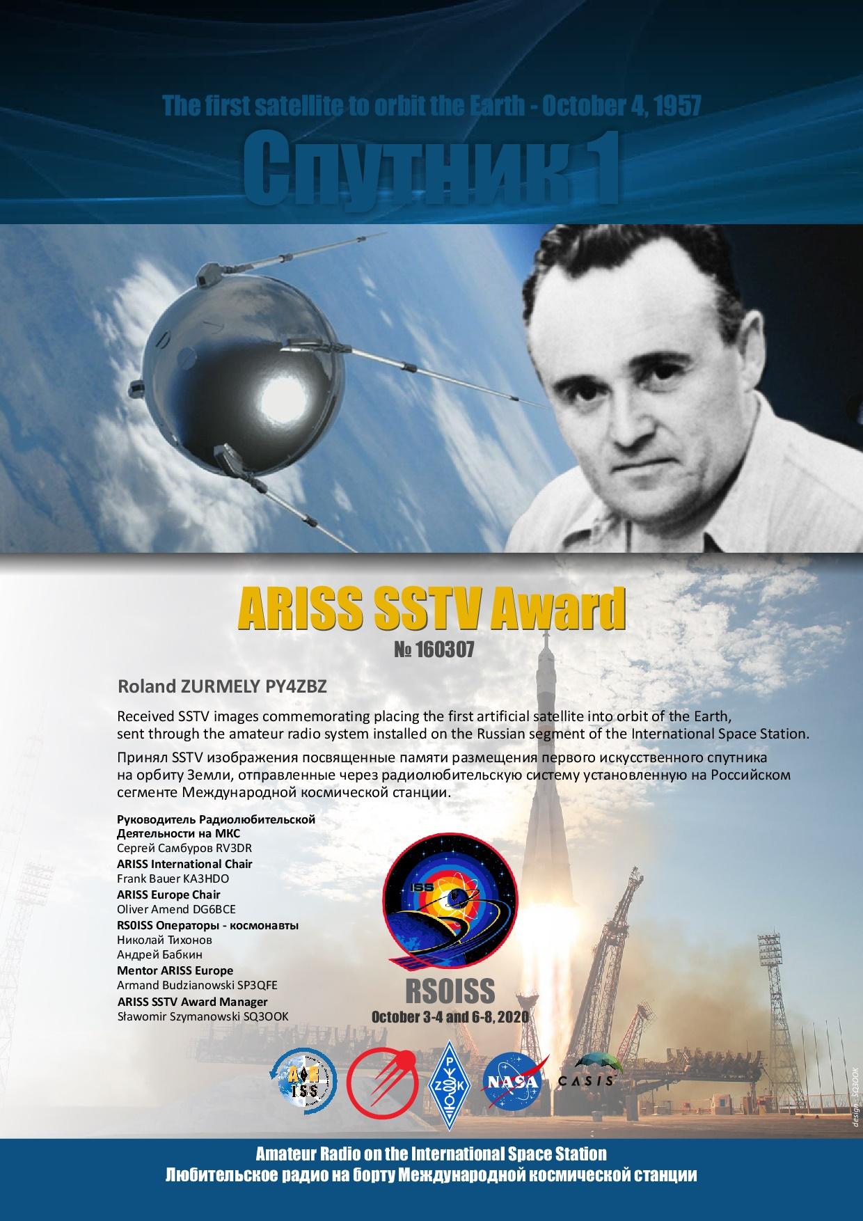 The picture on the diploma presents the first satellite <<Sputnik - 1>> which was placed in Earth orbit on 4 October 1957 and Sergei Korolev - the chief engineer and creator of Russian satellites and space crafts.