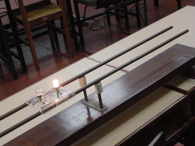 Um exemplo de carga resistiva é a antena dipolo dobrado, que apresenta 300 ohms na freqüência de ressonância, e portanto "casa" perfeitamente com a impedância característica da linha de Lecher. A foto seguinte mostra a energia irradiada pelo dipolo dobrado sendo recebida por um dipolo aberto ligado a uma lâmpada de filamento: