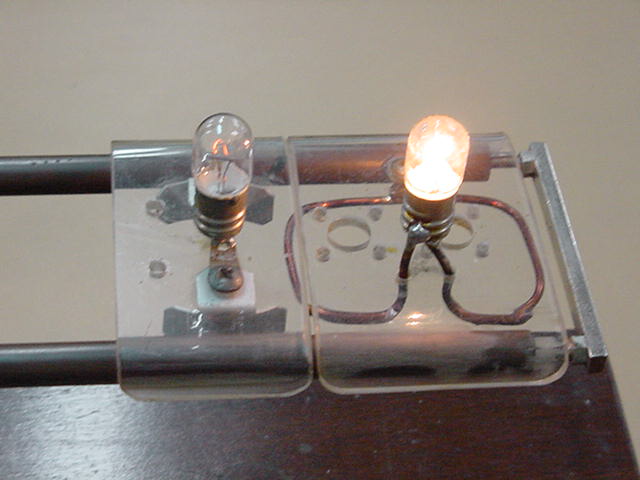 O sensor da esquerda é o sensor de CORRENTE: uma lâmpada de filamento (12 V 0,1 A) é ligada a uma espira de fio de cobre. Como este fio está curto-circuitando a lâmpada, é impossível existir nela uma tensão induzida pelo campo elétrico. Somente o campo magnético presente naquele ponto da linha, causado pela corrente presente na linha, conseguira induzir uma corrente na espira (lei de Faraday), fazendo com que o brilho da lâmpada seja uma medida qualitativa proporcional à corrente na linha.