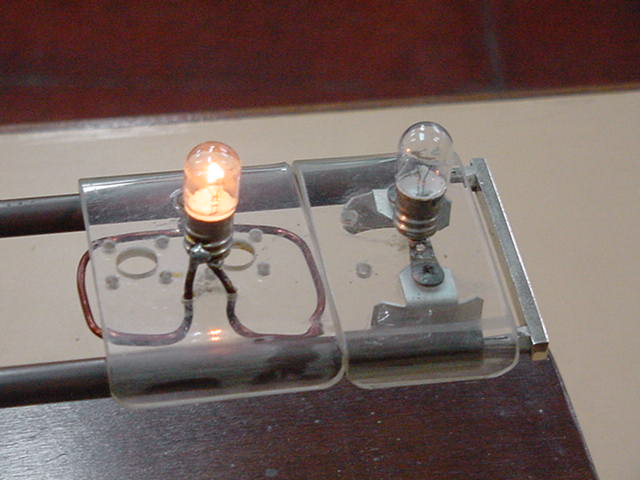 O sensor da direita é o sensor de TENSÃO: uma lâmpada de filamento (12 V 0,1 A) é ligada a duas plaquetas de metal, totalmente isoladas da linha, mas formando um divisor capacitivo com a linha. Como se trata de um circuito aberto, não é possível haver indução de corrente pelo campo magnético da linha, e somente o campo elétrico, gerado pela tensão presente naquele ponto da linha, fará circular uma corrente no divisor capacitivo e na lâmpada, cujo brilho é uma medida qualitativa proporcional à tensão na linha.