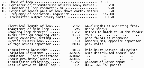Outro programa de AA5TB : o LOOP27.EXE (for DOS).(não inclui efeito do solo e não leva em conta a capacidade distribuída do próprio condutor do loop (erro que faz com que o valor do capacitor de sintonia seja calculado errado, para mais), mas permite ao usuário "chutar" um valor para resistência de perda adicional como solo, contatos do capacitor,etc...).