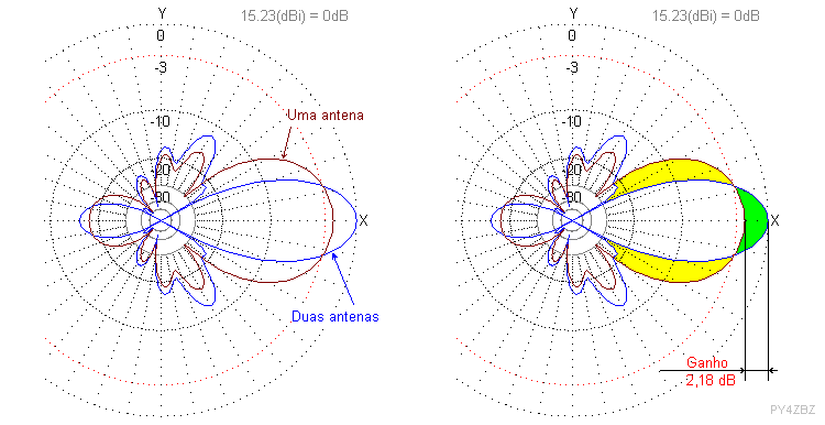 Ou seja, empilhando 2 antenas, podem obter um até +3 dB sobre o ganho de uma delas.