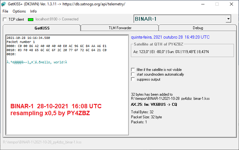 Em 28-10-2021 copiei e demodulei pela primeira vez o recente lançado satélite australiano BINAR-1.
