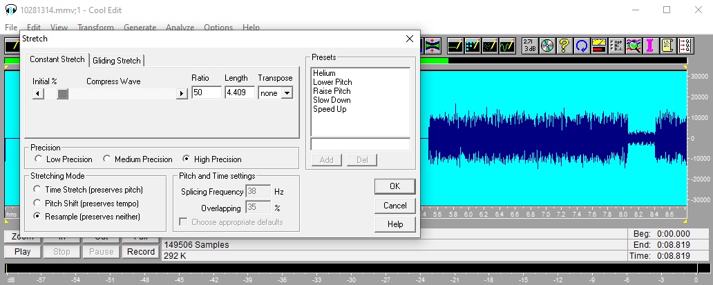 Como não temos demodulador para 1200 bps GMSK transmitido pelo BINAR, fizemos um resampling do áudio gravado para transformar a modulação em 2400 bps GMSK, dobrando a velocidade de reprodução do áudio, e demodulando com o HS-SoundModem 0,27 de UZ7HO, segundo uma idéia do JA0CAW. Para isso usamos o software CoolEdit: