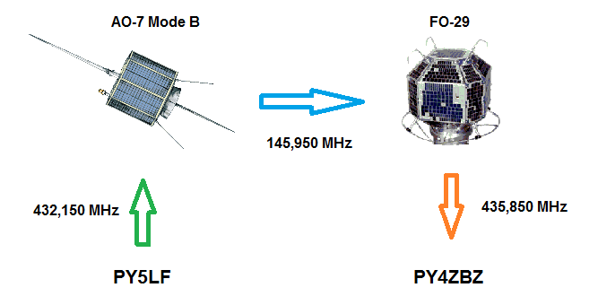 PY5LF Luciano acionou o AO7 modo B em CW em 432,150 MHz, que passou paralelamente ao FO-29, com uns 2000 km de separação constante, sendo o downlink em VHF do AO-7 recebido no uplink do FO-29, e retransmitido no seu downlink em UHF.