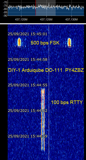 Em 25-09-2021 copiamos pela primeira vez o raríssimo sinal RTTY a 100 baud 7N2 450 Hz shift do DIY-1. A figura seguinte foi feita com uma gravação I/Q: