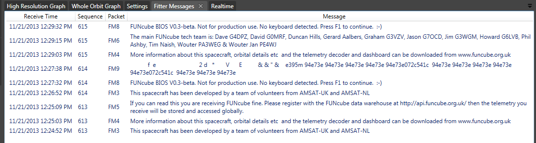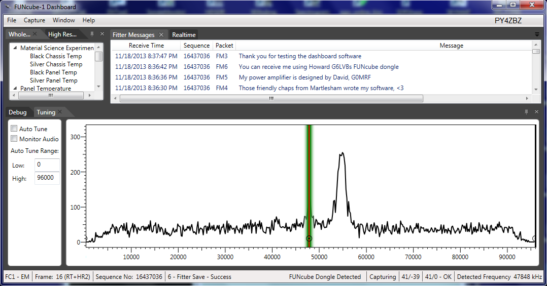 Em 21-11-2013 o FUNcube-1 foi lançado com sucesso, as 07:10:11 UTC ! E já na primeira passagem sobre o Brasil, na orbita #4, copiamos e decodificamos a telemetria, usando o FUNcube Dongle SDR como receptor com uma antena DCA, como mostram as figuras seguintes: