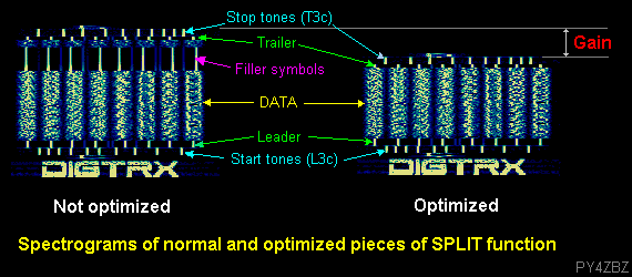 As figuras anteriores mostram a tela do DIGTRX, onde podem ser visualizados o nível correto do sinal recebido e processado pela placa de som ( a barra verde vertical), a sua forma de onda, o seu espectro e o respectivo espectrograma (também conhecido em inglês como Waterfall) :