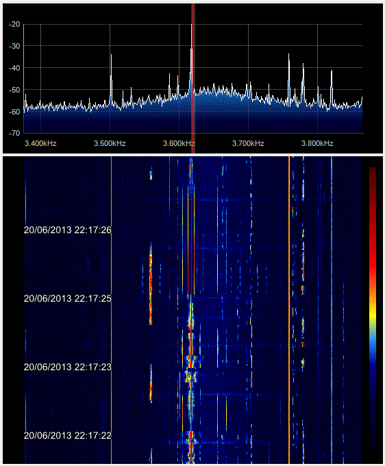 A figura seguinte mostra a banda de 40 metros, onde é até possível "ler" os sinais de CW ! :