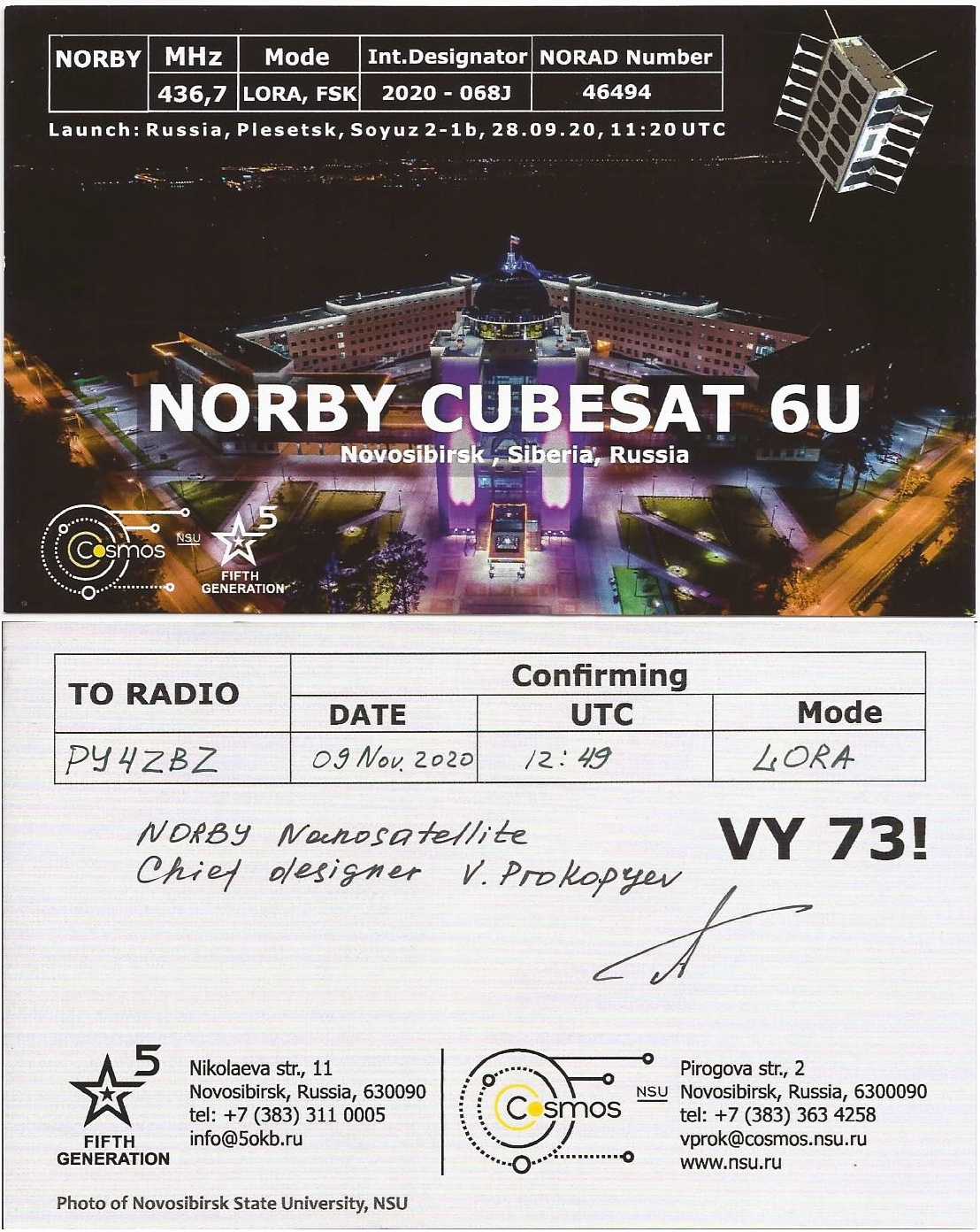O NORBY, construido pela Novosibirsk State University, foi lançado em 28-09-20202 por um foguete Soyuz-2-1b Fregat-M.