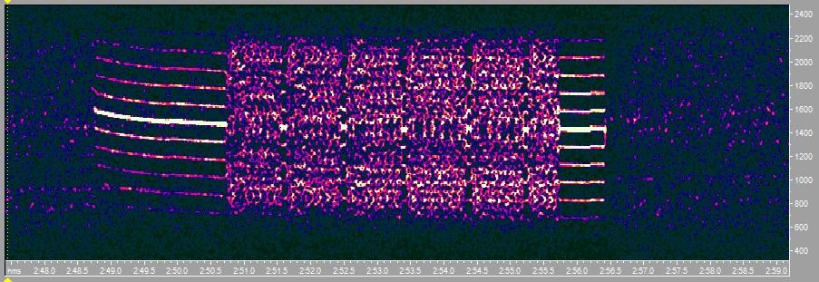 Espectrograma da transmissão do PW-Sat no inicio da #535 (a frequência de 68 kHz corresponde a 145,910 MHz):