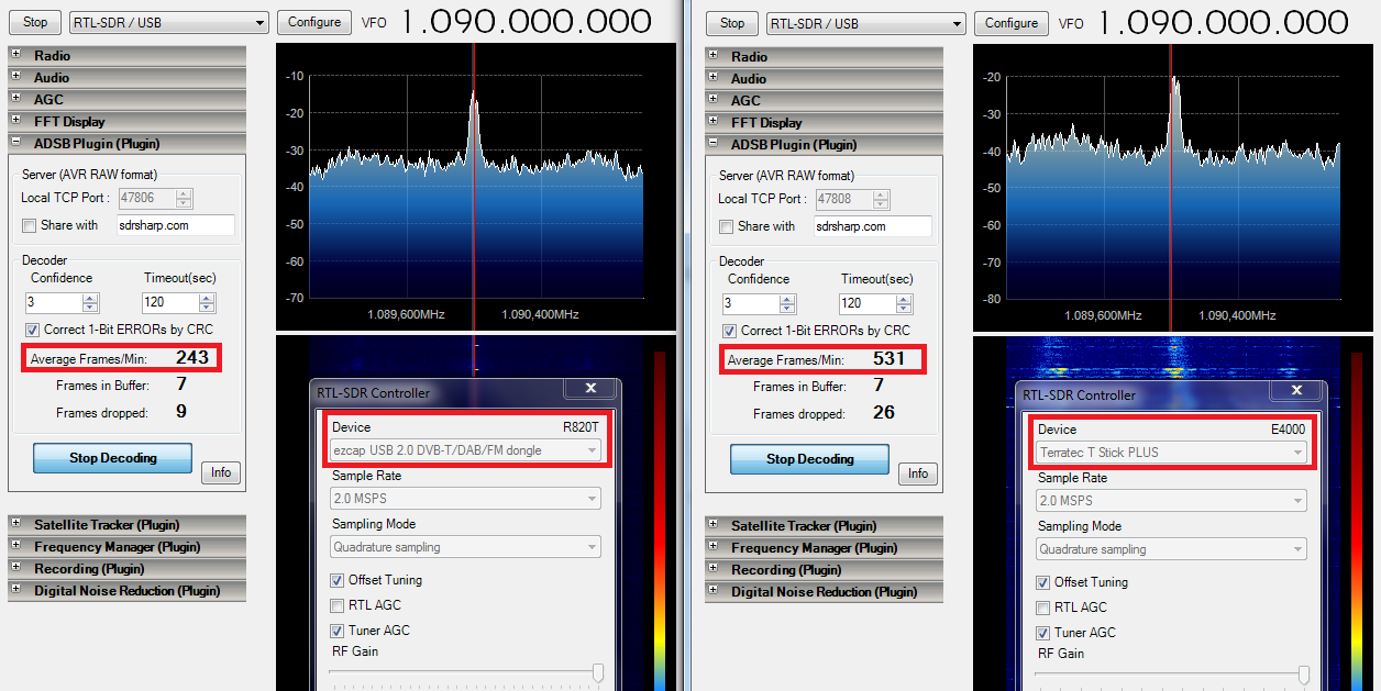 Na frequência do ADS-B (1090 MHz) os dois tem a mesma sensibilidade. O E4000 apresenta espúrios, que desaparecem com Tuner AGC ligado.