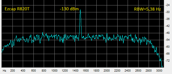 A figura seguinte mostra que os dois tem praticamente a mesma sensibilidade (menos de 1 dB melhor para o R820T), sendo que o R820T tem um patamar de ruído 10 dB maior (pior) que o E4000 em UHF. Um sinal de -127 dBm aparece 20 dB acima do ruído médio. Nas especificações, o E4000 tem um NF da ordem de 4 dB, e o R820T de 3,7 dB.