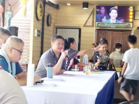 In the foreground, Kamol, E20EHQ (left) hands out an application form for the Intermediate Class examination on August 24 to Surachit, HS4HLW. The desk dispensing forms for the upcoming exam was busy throughout the meeting.