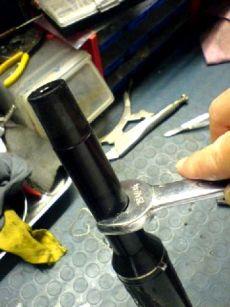 W tym celu mocujemy rękojeść w rurę w imadle, lewą ręką blokujemy rurę a prawą przykręcamy zawór. Uważamy, żeby nie przekręcić.
