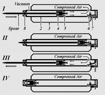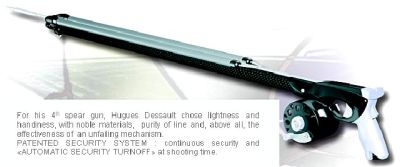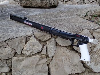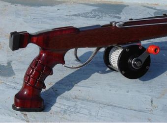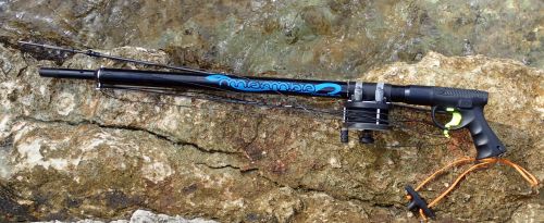 Wszystko to dzięki unikalnej konstrukcji w której w lufie nie ma wody /mały tłok z mono O-ringiem/. Prędkość strzały 6.5 mm o dług 100cm /Tahitiana/ to 22.4 m/s -przy 20atm. A często używa się i 34atm. Waga całej kuszy 1kg. Zupełny brak odrzutu. Rękojeść to zmodyfikowany Omer P. Cztery różne długości kuszy. Strzały oczywiście z najwyższej półki, czyli Devoto. A do tego przydatny manometr. Czułość spustu reguluje się śrubką znajdującą się pod spustem >>>> W Mambie nie ma przełącznika siły strzału Hi/Lo.