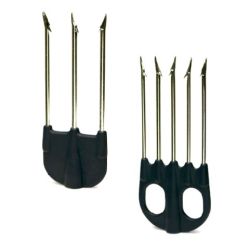 Są wykonane ze wzmocnionego włókna szklanego i zaprojektowane tak aby podstawowa guma wywierała nacisk wzdłuż lini trochę poniżej szyny trzymając strzałę w łożu szyny. Kiedy guma jest naciągana wsuwa się w uchwyty. Druga guma w double muzzle / podwójnej/ ciągnie z niższego otworu wylotu lufy redukując w ten sposób wyginanie lufy. Druga guma musi być dowiązana albo użyte drugie widełki.