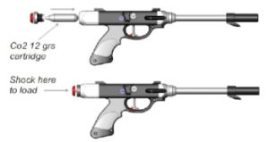 Tutaj aby napełnić butlę CO2 potrzeba mieć butlę przemysłową, taką na przykład od dystrybucji piwa, Coca Coli czy gaśnic i adaptor do ładowania CO2. Najłatwiej można znaleźć takie w sklepach Paintball. CO2 jest płynny i ciśnienie jest stałe przy ładowaniu płynnym CO2. W 0,5l butli jest 430gr CO2 a jeden strzał potrzebuje 30gr CO2 co daje ok. 15 strzałów z takiej butli.